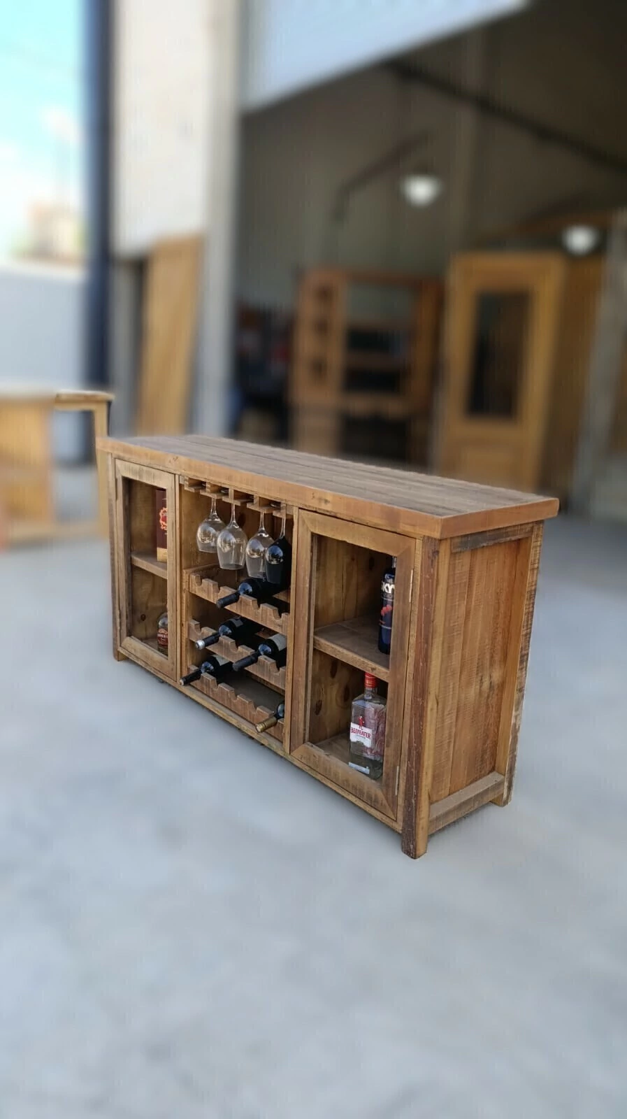 Es un mueble de líneas simples y presencia sólida, fabricado artesanalmente en maderas recuperadas. Su diseño combina funcionalidad y calidez, integrando espacios específicos para copas y botellas, junto con dos puertas de apertura convencional en cada extremo para almacenamiento adicional.